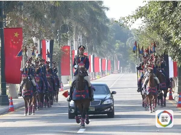 1月21日,国家主席习近平出席埃及总统塞西在库巴宫广场举行的盛大欢迎仪式。这是在马队护卫下,习近平乘车抵达库巴宫。