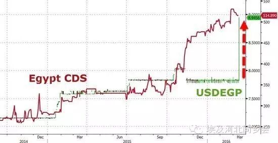 由下去可以看出,尽管埃及镑自去年中期以来官方价格稳定(绿线),但自由交易的埃及信用违约互换(CDS)市场上,为埃及债券可能违约而缴纳的“保险费”上涨了56%: