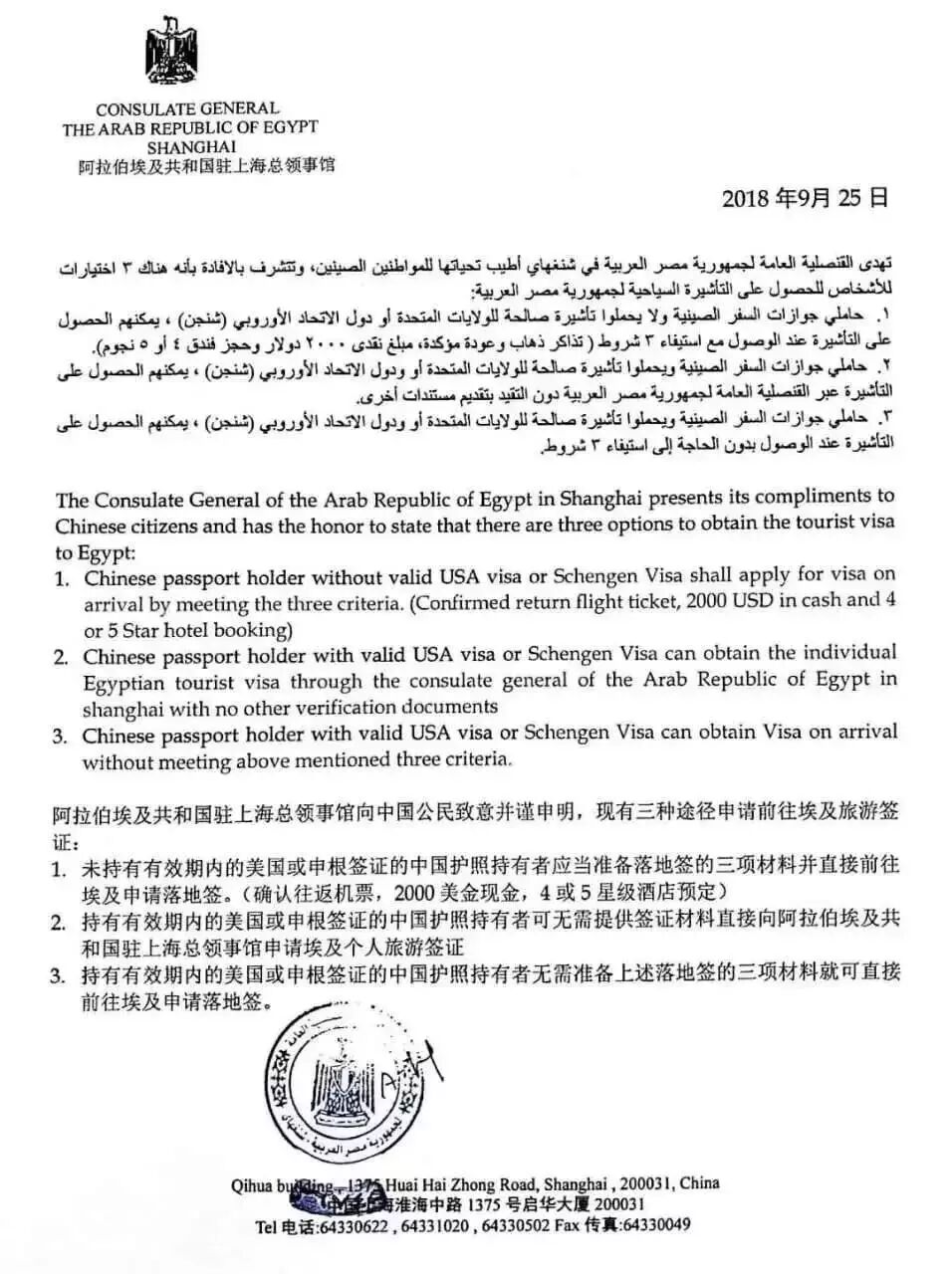 最近,埃及领事馆发布最新公告,中国护照上持有效期内的美签或申根签就能直接申请埃及个人旅游签证。