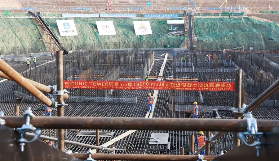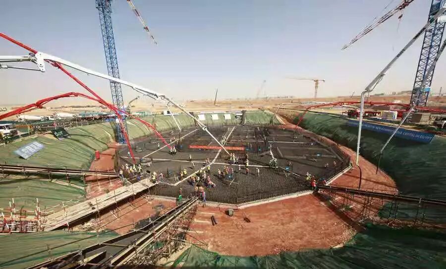 埃及新首都中央商务区标志塔主楼1.85万立方米超大型混凝土基础底板隆重开盘,标志着埃及新首都中央商务区项目全面提速。现场浇筑的直径约70米、厚达5米的多边形钢筋混凝土底板,在创下非洲建筑工程最大基础底板浇筑新纪录同时,将托举起雄伟的非洲第一高楼——埃及新首都中央商务区标志塔,具有里程碑的重大意义。