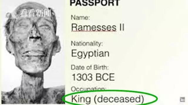 埃及当局后来出具了拉美西斯二世木乃伊的护照,护照上印有木乃伊照片,职业一栏则填写为"国王(已故)"