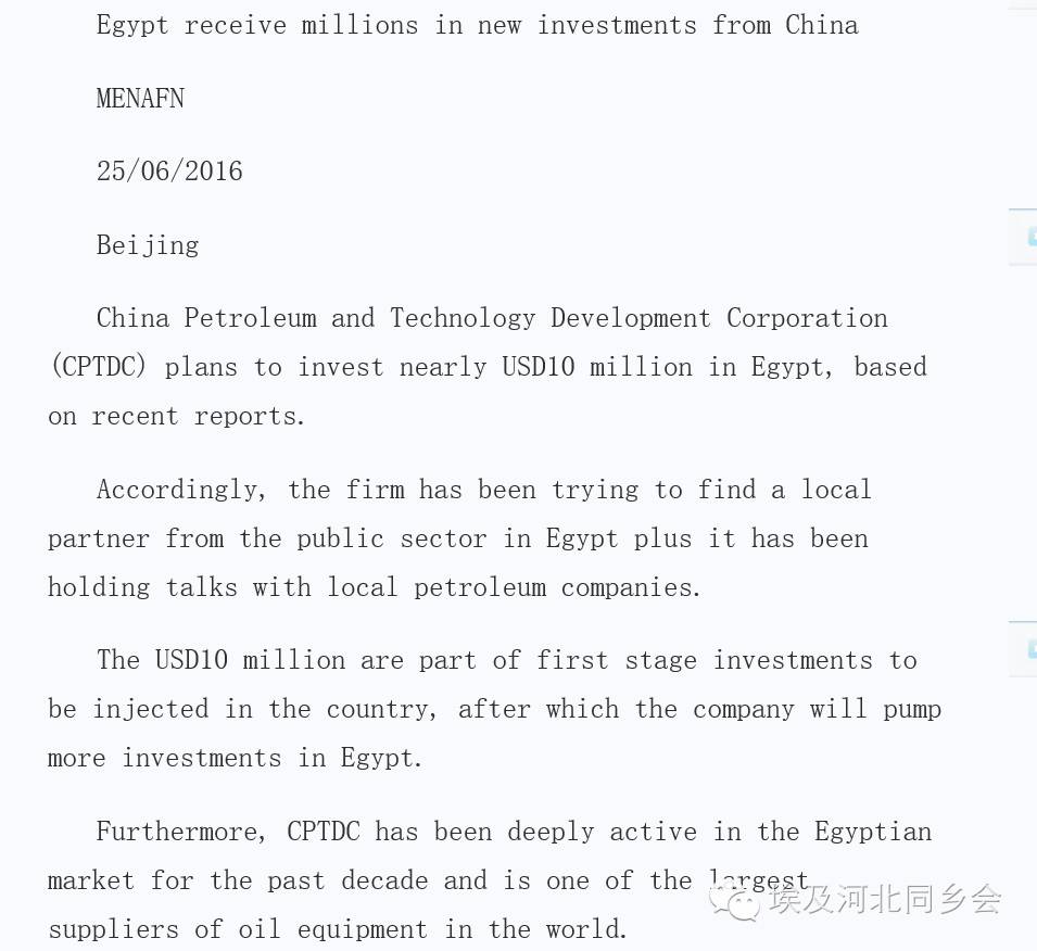 据MENAFN网站6月25日北京报道,根据最新报道,中国石油麾下的全资子公司中国石油技术开发公司计划向埃及投资大约1000万美元。 据悉,中技开一直在设法在埃及从公共部门找到一个当地合作伙伴,为此,中技开一直在与当地的石油公司举行会谈。 这1000万美元是中技开将注入这个中东国家的第一阶段投资的一部分。在今后,中技开将向埃及注入更多的投资。 在过去10年里,中技开一直深深活跃在埃及市场。 中技开是世界上最大石油设备供应商之一。