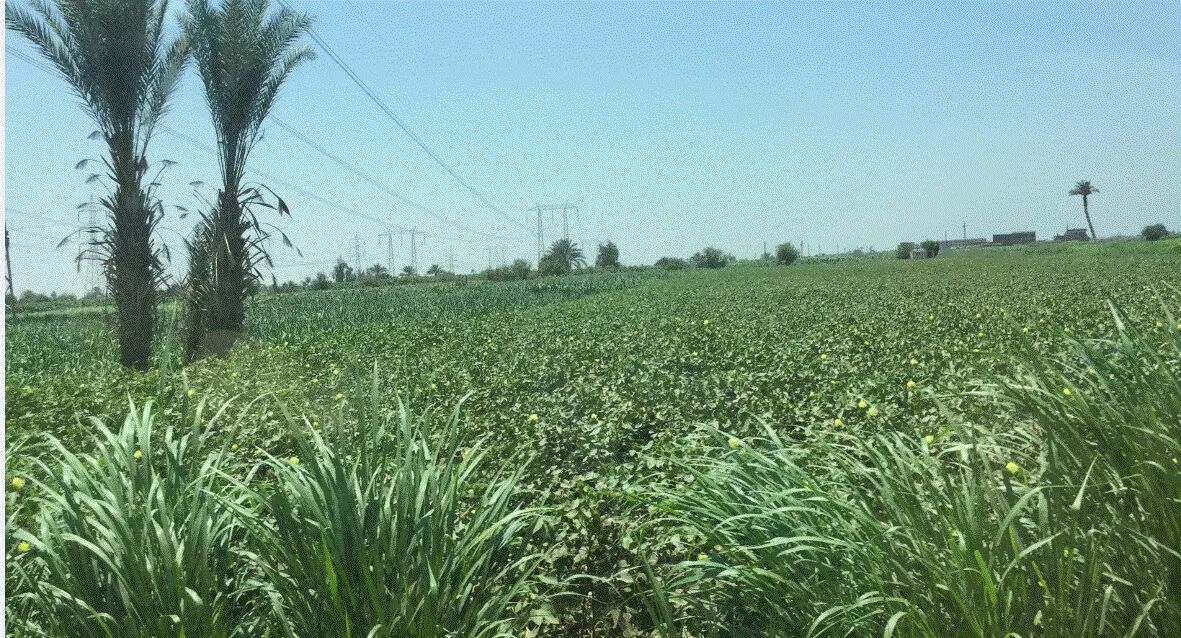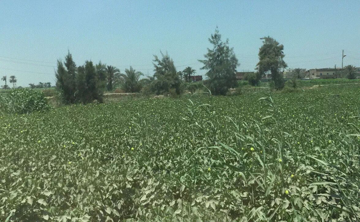 绿油油的埃及长绒棉田,棉田边缘种植着牧草