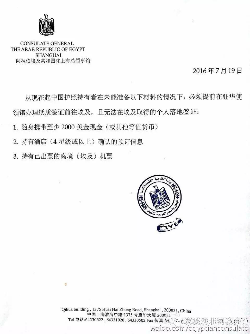 埃及驻上海总领事馆通知