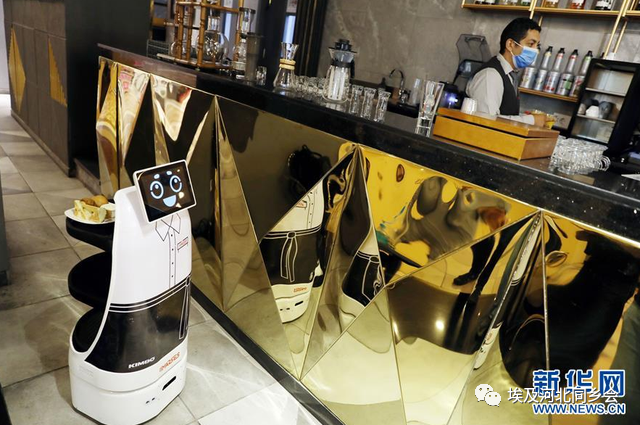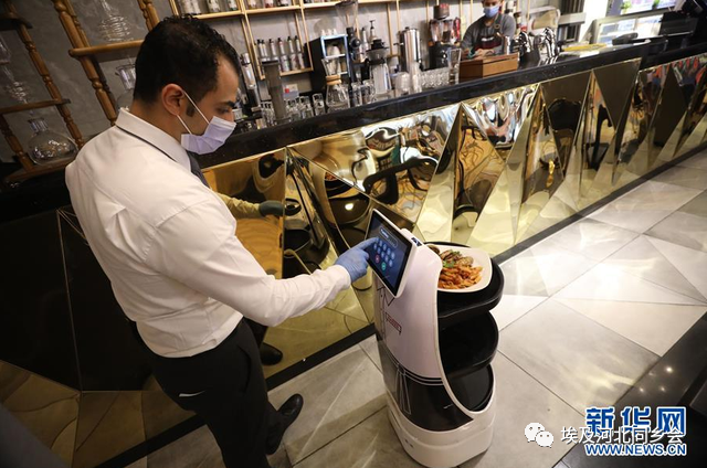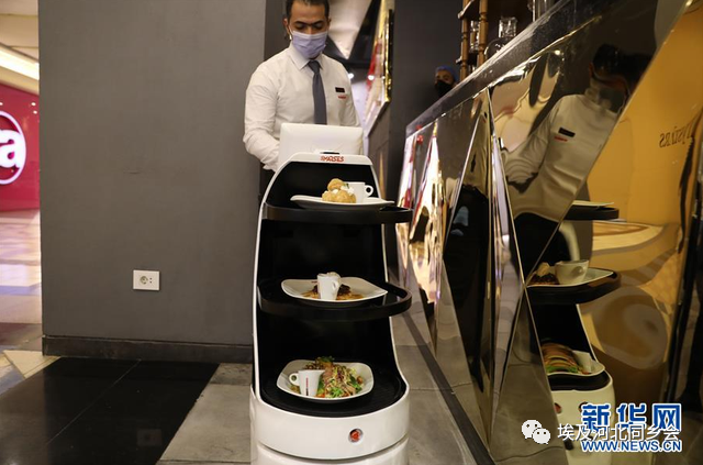 8月7日,在埃及首都开罗一家餐厅,机器人准备给顾客上菜。 开罗的一家餐厅于新冠疫情期间利用机器人上菜,以减少服务员和顾客之间的非必要接触,保持社交距离。 新华社发(艾哈迈德·戈马摄)