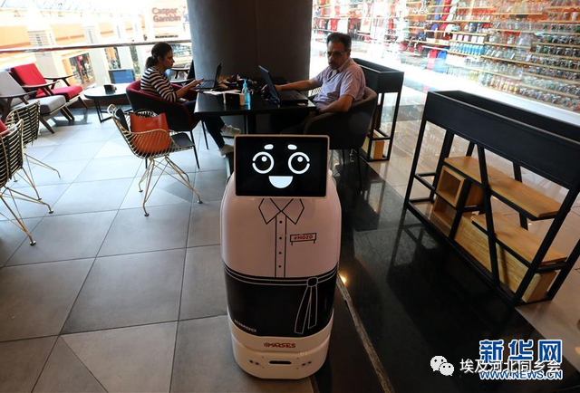 8月7日,在埃及首都开罗一家餐厅,机器人给顾客上菜。 开罗的一家餐厅于新冠疫情期间利用机器人上菜,以减少服务员和顾客之间的非必要接触,保持社交距离。 新华社发(艾哈迈德·戈马摄)