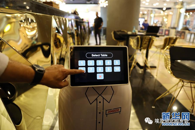 8月7日,在埃及首都开罗一家餐厅,服务员为机器人设置送餐桌号。 开罗的一家餐厅于新冠疫情期间利用机器人上菜,以减少服务员和顾客之间的非必要接触,保持社交距离。 新华社发(艾哈迈德·戈马摄)