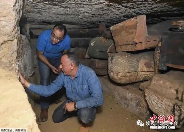 近日,在埃及开罗南部的塞加拉,埃及总理穆斯塔法·马德布利(左)和最高文物委员会秘书长莫斯塔法·瓦齐里(Mostafa Waziri)视察埃及考古学家最近在开罗以南的一个巨大墓地出土的一批古代棺材和文物。旅游和文物部在一份声明中说,考古学家发现了大量2500多年前的彩色密封石棺。