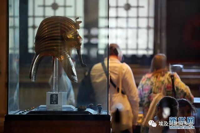 5月18日,游客在埃及开罗的埃及博物馆的图坦卡蒙黄金面具旁参观。