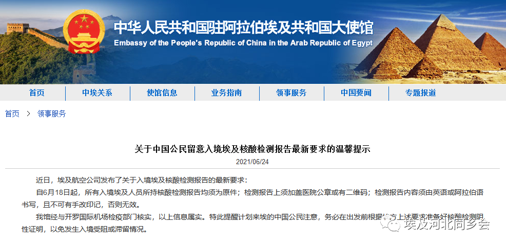 要求指出,自6月18日起,所有入境埃及人员所持核酸检测报告均须为原件;检测报告上须加盖医院公章或有二维码;检测报告内容须由英语或阿拉伯语书写,且不可有手改印记,否则无效。 中国驻埃及大使馆提醒计划入境埃及的中国公民注意,务必在出发前根据埃方上述要求准备好核酸检测阴性证明,以免发生入境受阻或滞留情况。