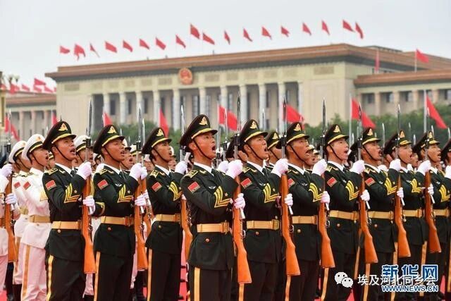 7月1日上午,庆祝中国共产党成立100周年大会在北京天安门广场隆重举行。这是国旗护卫队唱国歌。