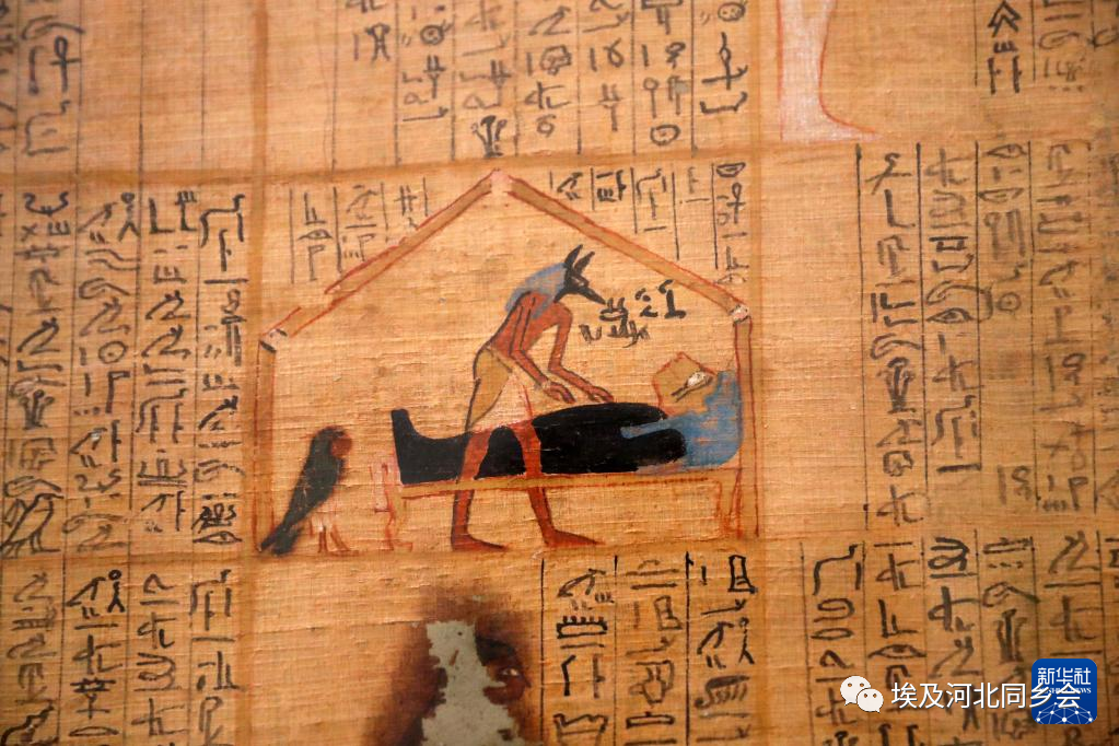 这是5月14日在位于埃及开罗的埃及博物馆拍摄的一幅绘有“阿努比斯”制作木乃伊的莎草画。 埃及博物馆位于埃及首都开罗市中心,于1902年正式对外开放,珍藏着众多自古埃及法老时代至公元6世纪的历史文物。“阿努比斯” 是古埃及神话中一位与木乃伊制作及死后生活有关的神,其形象通常被描绘成一只胡狼,或是一位有着胡狼头的男性,出现在众多法老时代的文物中。埃及博物馆中形式多样的“阿努比斯”为主题的文创产品,受到人们喜爱。