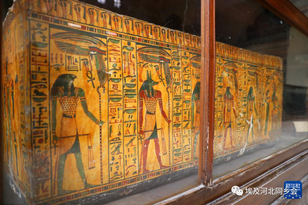 这是5月14日在位于埃及开罗的埃及博物馆拍摄的绘有“阿努比斯”的木乃伊棺椁。 埃及博物馆位于埃及首都开罗市中心,于1902年正式对外开放,珍藏着众多自古埃及法老时代至公元6世纪的历史文物。“阿努比斯” 是古埃及神话中一位与木乃伊制作及死后生活有关的神,其形象通常被描绘成一只胡狼,或是一位有着胡狼头的男性,出现在众多法老时代的文物中。埃及博物馆中形式多样的“阿努比斯”为主题的文创产品,受到人们喜爱。