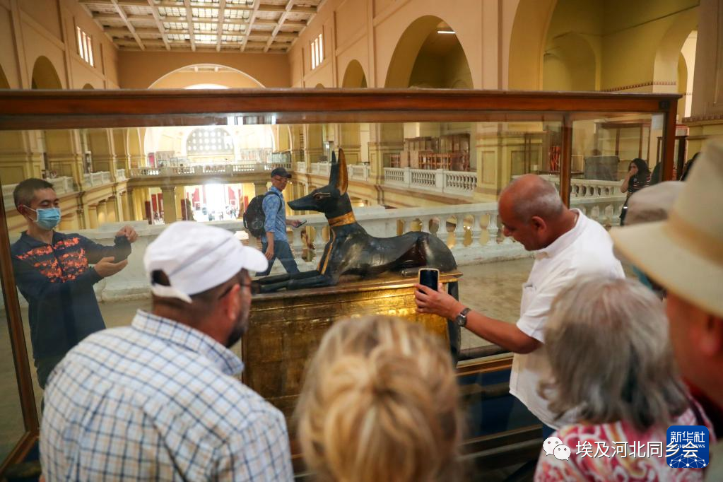 5月14日,在位于埃及开罗的埃及博物馆,游客参观法老图坦卡蒙墓中出土的“阿努比斯”雕像。 埃及博物馆位于埃及首都开罗市中心,于1902年正式对外开放,珍藏着众多自古埃及法老时代至公元6世纪的历史文物。“阿努比斯” 是古埃及神话中一位与木乃伊制作及死后生活有关的神,其形象通常被描绘成一只胡狼,或是一位有着胡狼头的男性,出现在众多法老时代的文物中。埃及博物馆中形式多样的“阿努比斯”为主题的文创产品,受到人们喜爱。