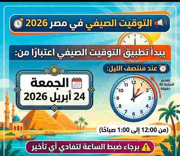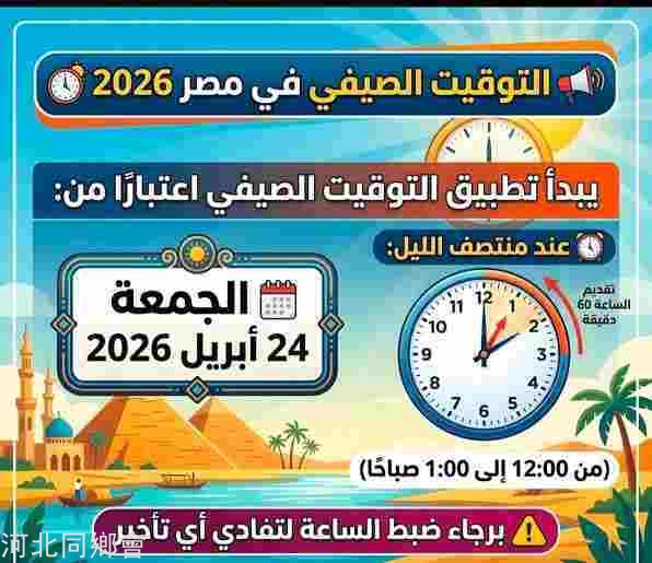 【温馨提示】2026年埃及夏令时确定 4月24日零时起时钟拨快1小时埃及政府依据2023年第24号总统批准法律,正式确定2026年夏令时具体实施时间,将于2026年4月24日启动。根据法律安排,时钟调整将在4月23日至24日午夜00:00进行,时间向前拨快1小时,直接变为01:00。按照现行法律规定,埃及夏令时固定为每年4月最后一个星期五开始,至10月最后一个星期四结束。实行夏令时主要为充分利用日照时间、节约能源消耗、优化工作与生活作息效率,是埃及国家能源管理与资源优化的重要举措。编译:马广辉(慕德中埃贸易公司董事长、埃及中华总会副会长、中埃网副主编、慕德经贸研习社主理人)本文来自网友发表,不代表本网站观点和立场,如存在侵权问题,请与本网站联系删除!