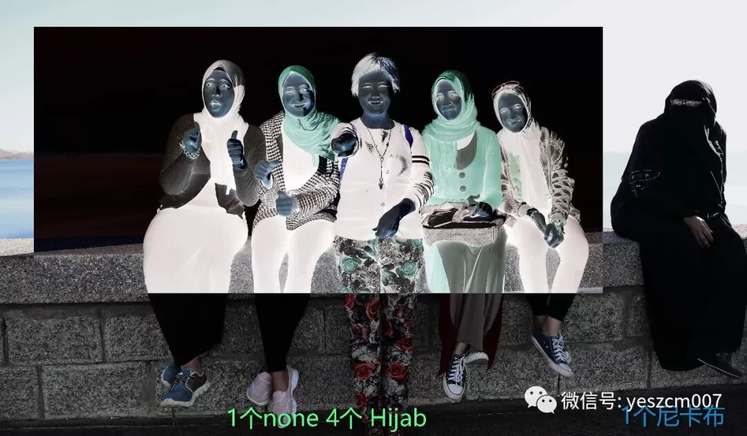 我拍到一组混合照,一个none(无遮蔽的中国人),四个Hijab,还有一个本能斜避的Niqab,这幅相片经过剪裁,可以做联合国教科文的宣传资料,她们和谐、自然的笑容可以感染全世界,但不剪裁才是真实的不和谐世界,Niqab显得格格不入,甚至有点让人害怕,这是原教旨和极端主义给我们留下的阴影。