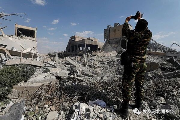 当地时间2018年4月14日,叙利亚大马士革,被轰炸的叙利亚研究中心一片废墟,一位士兵正在拍摄视频。