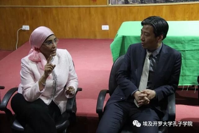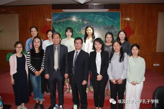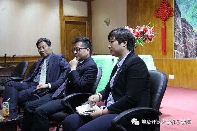 4月23日下午,孔子学院总部副总干事、国家汉办副主任郁云峰、国家汉办审计处副处长刘臻、、亚非孔子学院副处长李宏宇、亚非孔子学院项目官员张京晶一行在中国驻埃及大使馆教育处宋波参赞的陪同下来到开罗大学孔子学院,与孔院的汉语教师及志愿者进行了亲切交流。