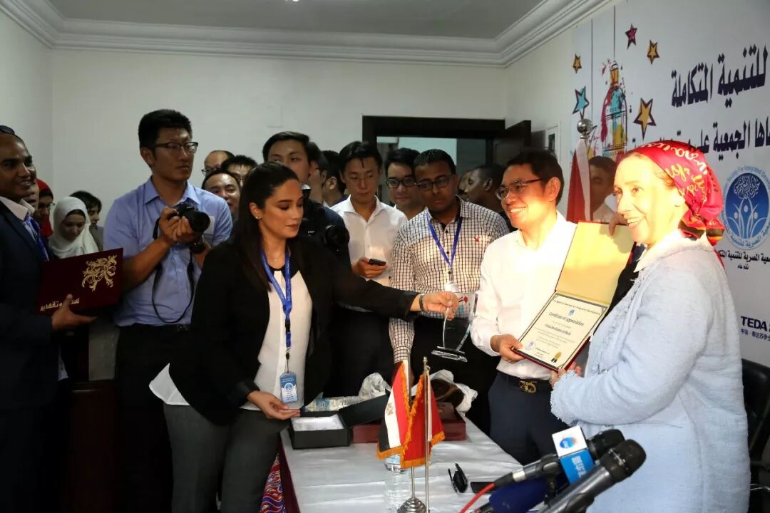 埃及慈善机构——共同发展协会负责人哈娜女士为使馆和有关中资企业代表颁发了证书,感谢中方支持埃及斋月慈善活动,这体现了中方对埃及民众生活的关心,彰显了两国的兄弟情谊。
