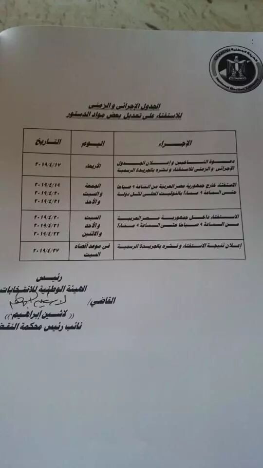 埃及全国选举委员会今天宣布了境内外公投时间表,并表示最晚不迟于4月27日将宣布全民投票结果。