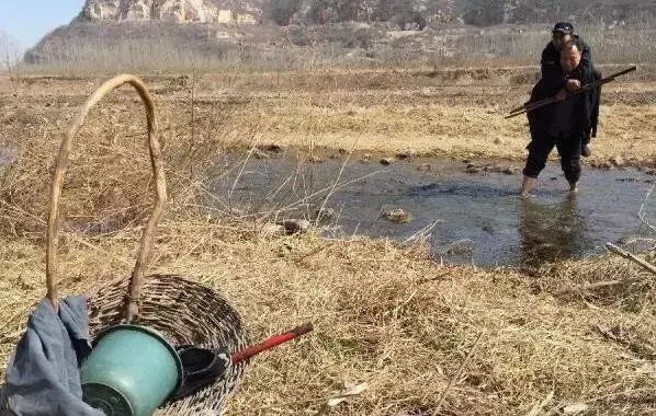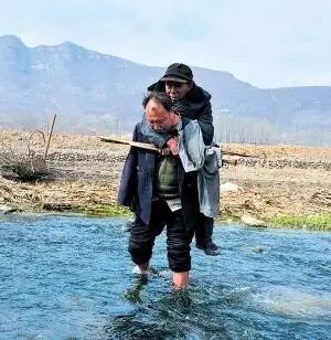 过河时,贾海霞帮贾文其卷起裤腿,贾文其就背上贾海霞趟过去。