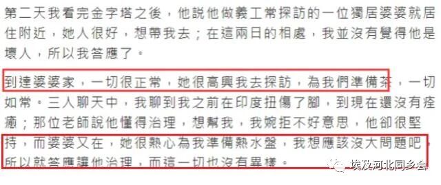 而在两人看完金字塔后,该老师说带陈慧敏去他经常做义工的一位老奶奶家,在前两天的相处中,陈慧敏也觉得他比较有爱心,随即一同去了。在到达老奶奶家后,一开始一切都很正常,老人也对陈慧敏的到访比较开心,三人一起坐着喝茶聊天。在陈慧敏聊到自己之前扭到了脚还未痊愈时,那位老师立马表示自己懂得治理,想帮陈慧敏治疗。对于陌生男子和自己的身体接触,陈慧敏婉拒了,不过他一直坚持,老奶奶也热情地打了盆热水坐等老师为她推拿。盛情难却,陈慧敏无奈,只好答应了。
