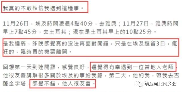 而在开罗的那段经历,以及险些被人侵犯的过程,陈慧敏也记录了下来,表示自己只想给其他的旅行者一个前车之鉴,希望不要再发生类似的事情。陈慧敏说自己到达开罗的第一天感觉还不错,也有幸遇到了一位当地的老师,同时这位老师也为她讲了很多关于埃及的事情,第二天还带她去了吉萨金字塔。在两人相处的过程中,陈慧敏觉得此人比较友善,所以没有太大的戒备心。