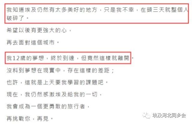 从陈慧敏的文字中看,埃及之行是她的梦想,而在这个梦想的实现过程中,却出现了如此匪夷所思的事情。尽管我们不能因为一个人去否认一座城市,但在独自旅行、找寻自我的过程中,最重要的还是保护好自己的安全,让类似陈慧敏这样的事情,再也不要发生。