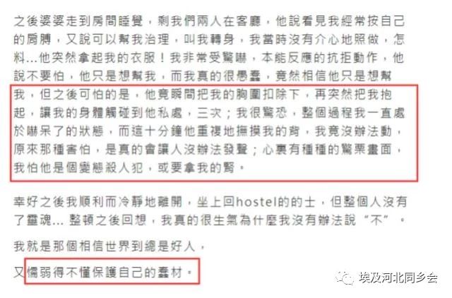 11月27日,澳门女歌手陈慧敏在社交平台上发长文说自己在埃及独自旅行时险被一位当地老师性侵。陈慧敏在这段文字中详细记录了当时的细节,只是单纯地看文字表述,就让不少网友心惊。异国他乡,无依无靠,发生这种事情可以说真的是叫天不应叫地不灵。不过幸好陈慧敏幸运,最后逃出了魔窟,否则后果不堪设想。