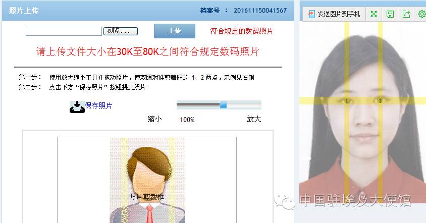 点击“浏览”,从电脑上选择一张规格在30K-80K之间的照片,具体要求可点击“符合规定的数码照片”查看。选择完后,点击上传。上传成功后,对照黄线调整照片位置及大小。完成后点击“保存”并点击“下一步”。