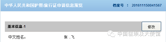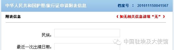 选择“埃及”、“各领馆以外的区域”和“驻埃及使馆”后,点击确定,将自动生成档案号。