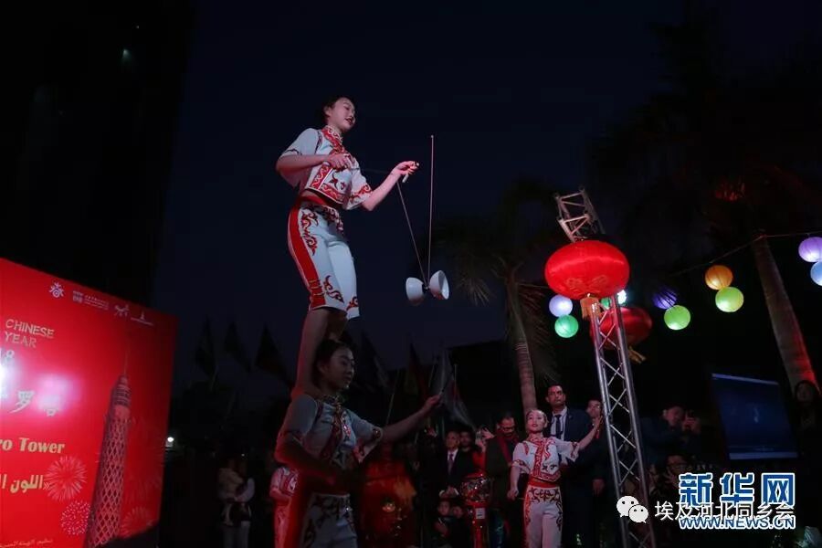当日,开罗地标建筑开罗塔举行点亮“中国红”活动,同时展示杂技、舞狮、川剧变脸等文化表演,庆祝中国农历新年。新华社发(艾哈迈德·戈马摄)